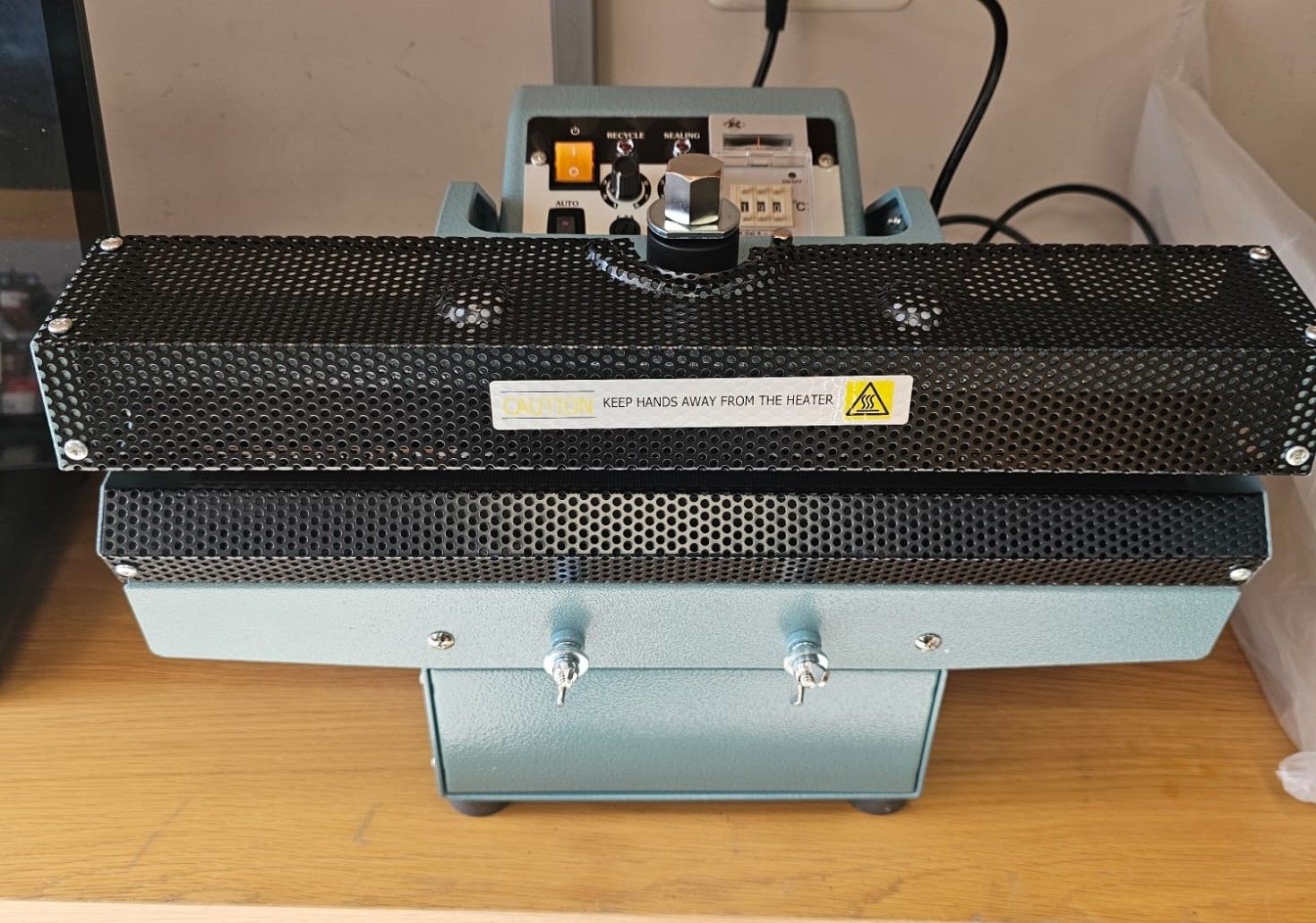 מכשיר ידני לסגירת שקיות ניילון עם סכין חיתוך.